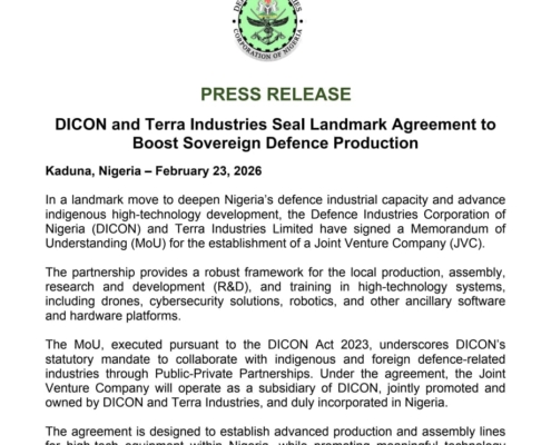 In a continuous effort to establish a strategic partnership aimed at boosting indigenous defence production, Defence Industries Corporation of Nigeria (DICON) marked another milestone having signed a new Memorandum of Understanding (MoU)…
